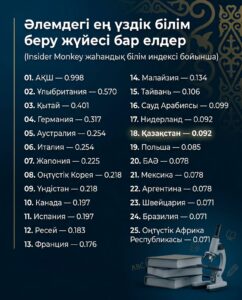 Қазақстан Insider Global Education Index рейтингінде 0,092 балл жинап, 18-орынға ие болды және тұрақты дамып келе жатқан әрі халықаралық деңгейде ықпалдасқан білім беру жүйелері бар елдер тобына енді.